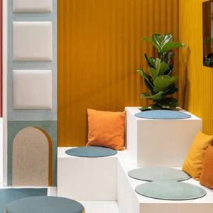 Kolekce zahrnuje různé tvary a povrchy, které dodávají prostoru dynamiku a zároveň snižují ozvěnu.