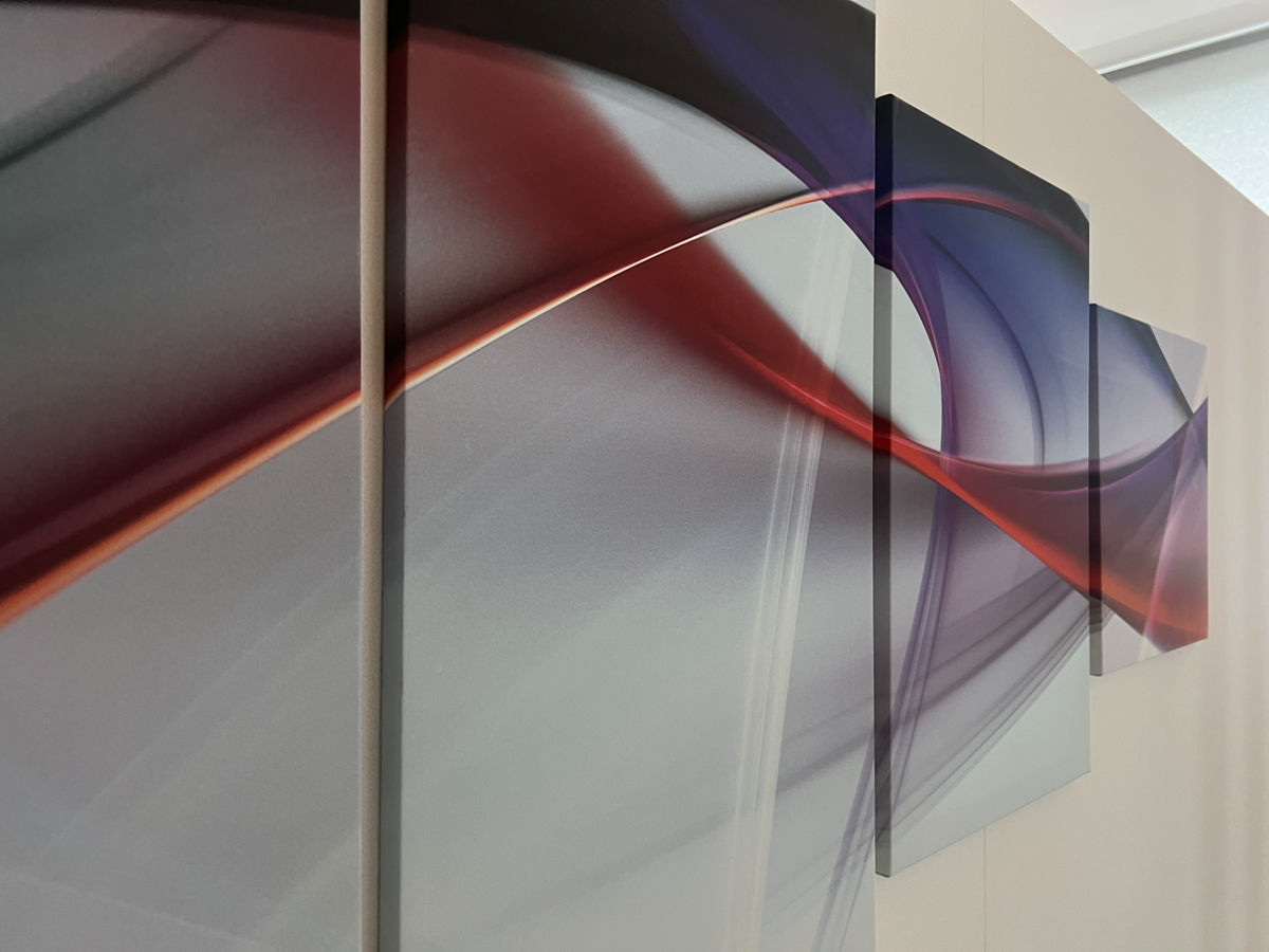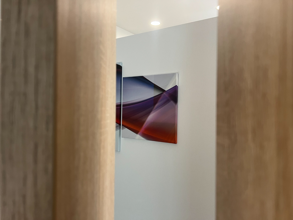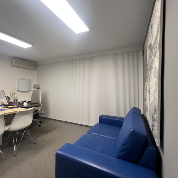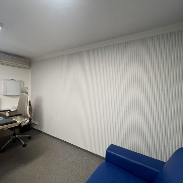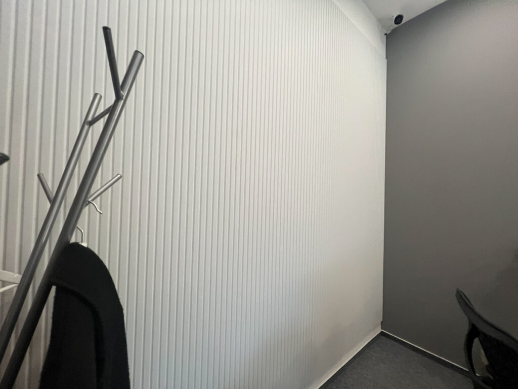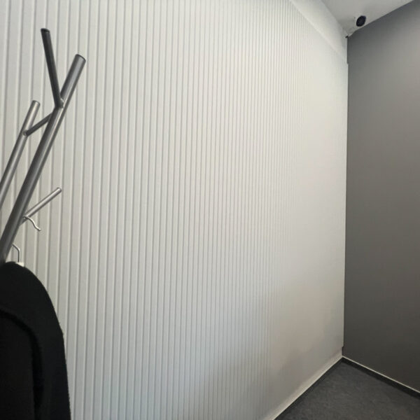Na stěny jsme aplikovali frézované PET panely, které slouží jako akustický prvek, ale zároveň doplňují estetiku prostoru. Standartní řešení jsme doplnili o netradiční prvek, akustické panely Ecophon Akutex™, které jsme použili pro vytvoření akustické dělící stěny. Ty byly osazeny na existující policovou skříňku tak, aby pohlcovali zvuk z obou stran a zároveň vytvořily funkční předěl mezi zónami.