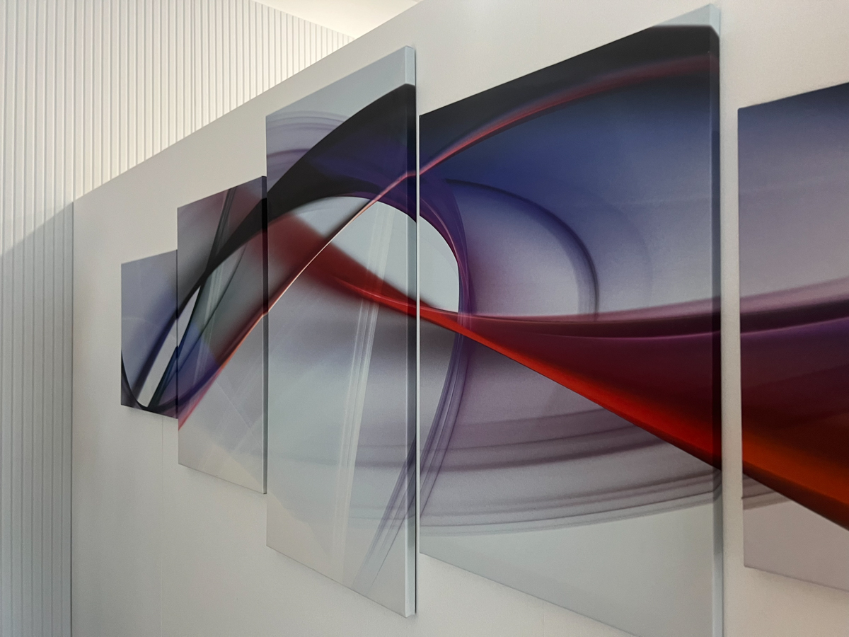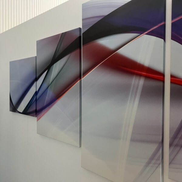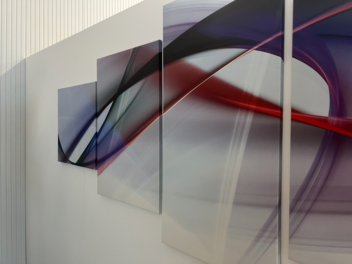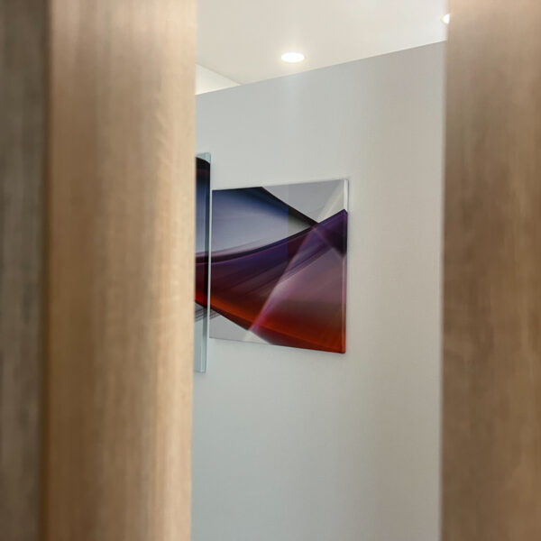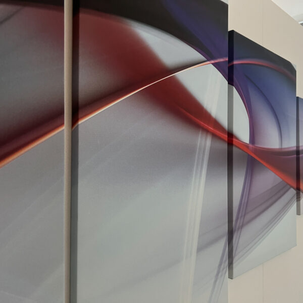 Na stěny jsme aplikovali frézované PET panely, které slouží jako akustický prvek, ale zároveň doplňují estetiku prostoru. Standartní řešení jsme doplnili o netradiční prvek, akustické panely Ecophon Akutex™, které jsme použili pro vytvoření akustické dělící stěny. Ty byly osazeny na existující policovou skříňku tak, aby pohlcovali zvuk z obou stran a zároveň vytvořily funkční předěl mezi zónami.