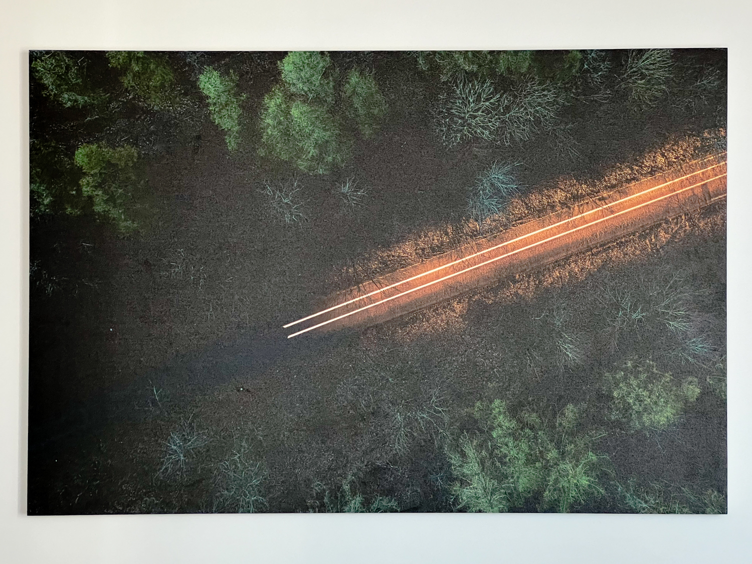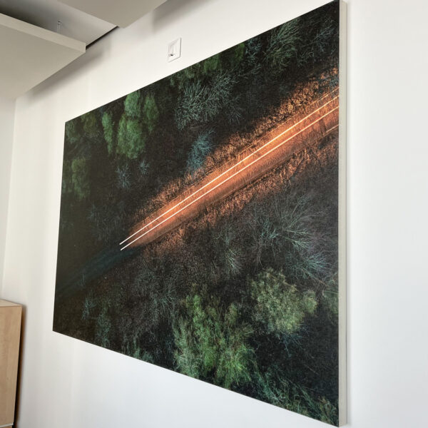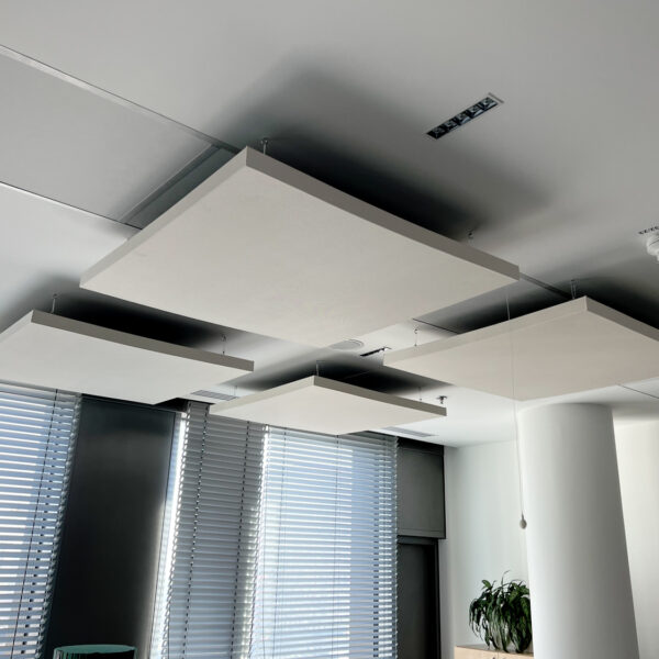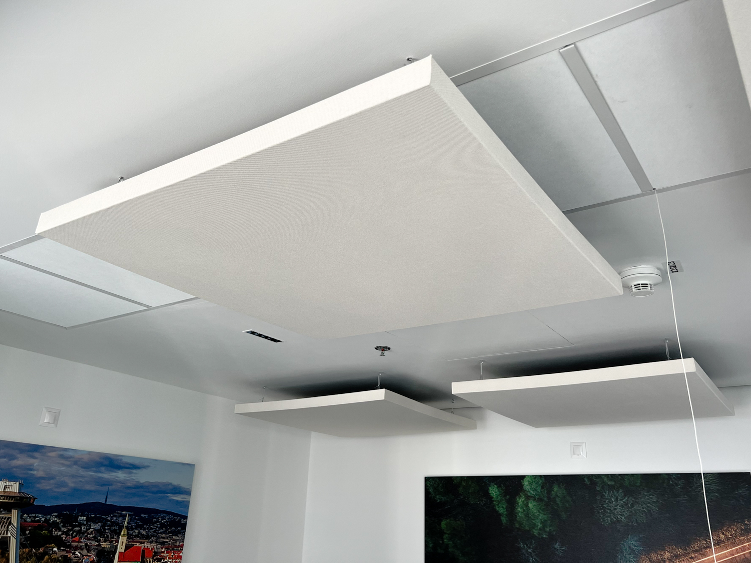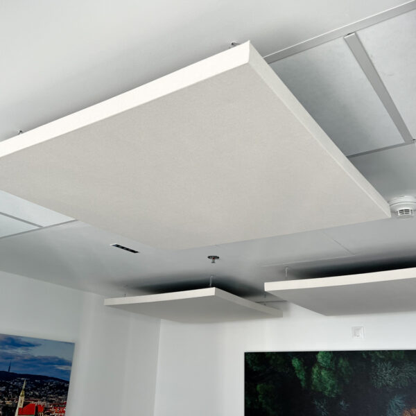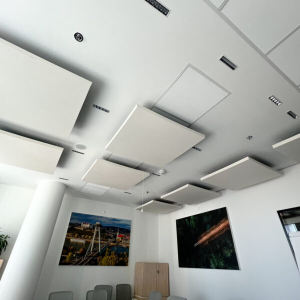 Textilní akustický panel, určený k zavěšení nebo nalepení na strop, ke snížení ozvěny.