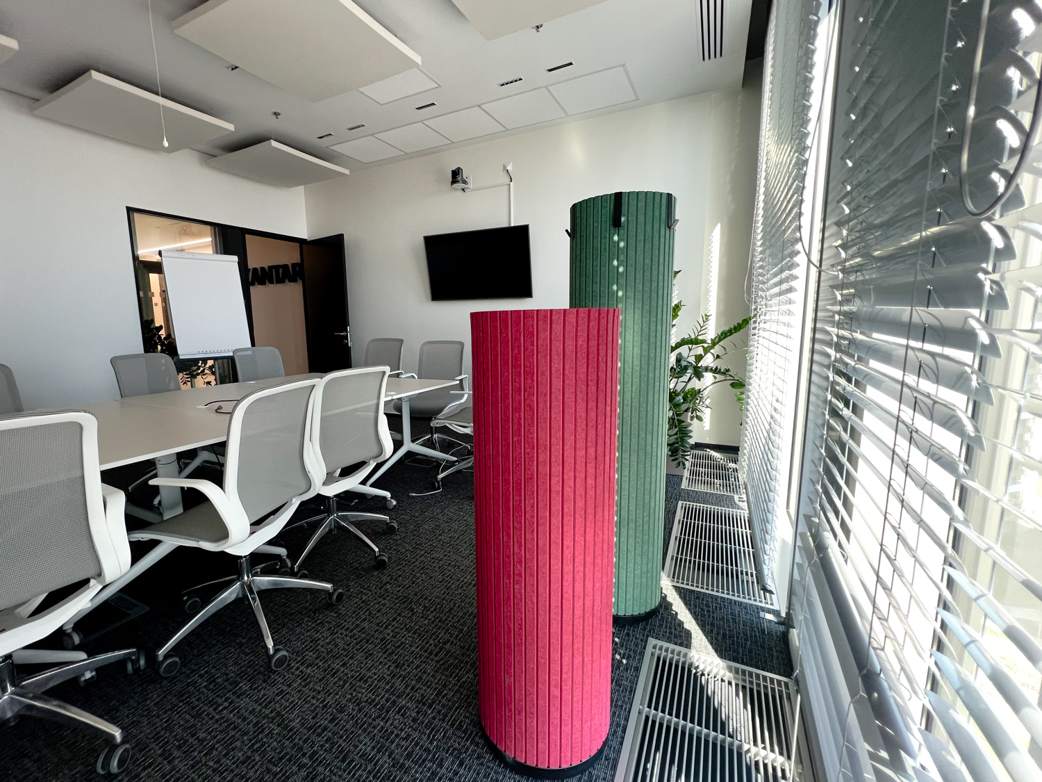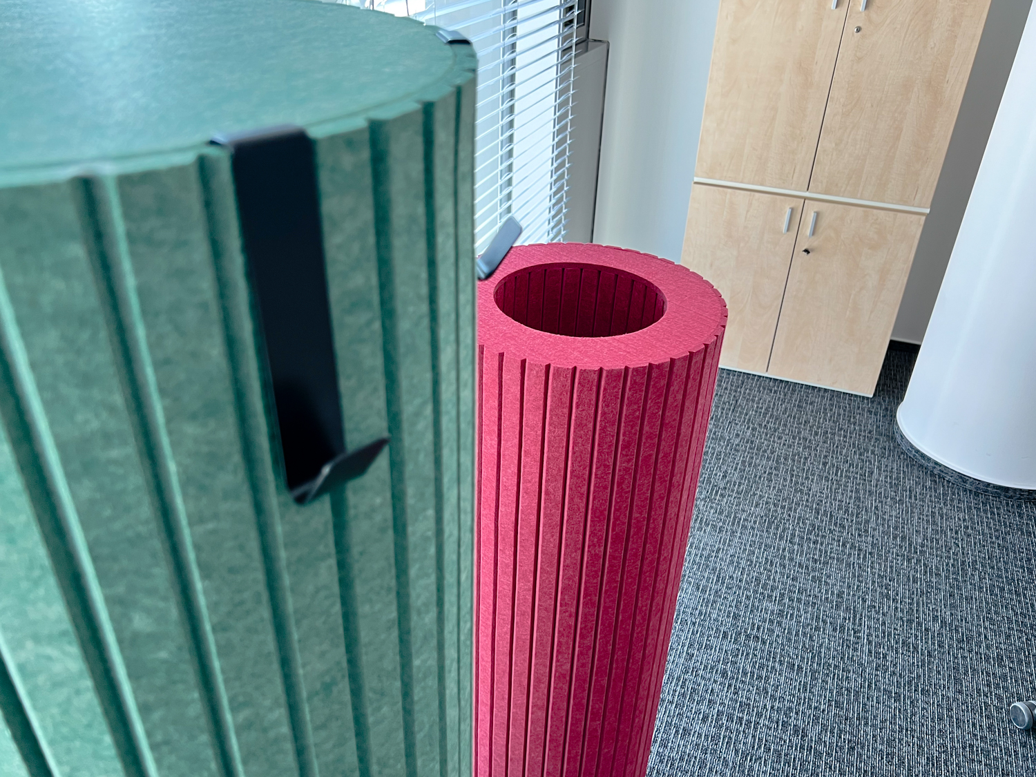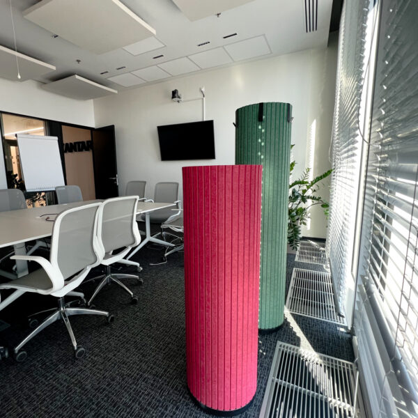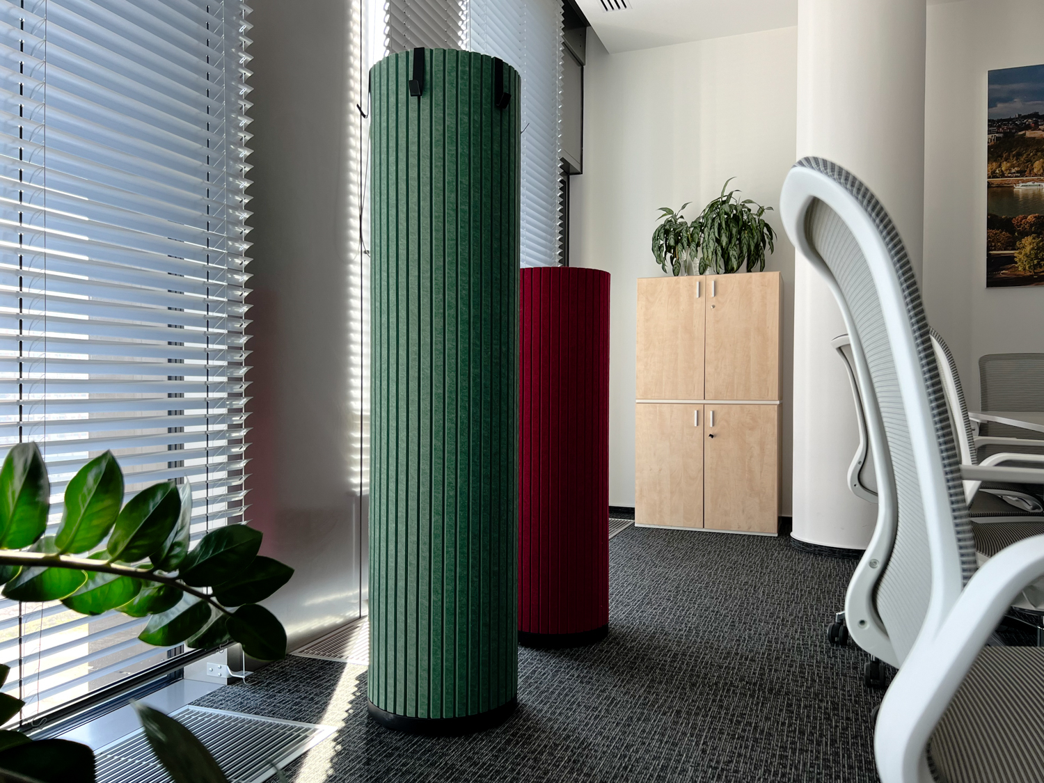 Akustické sloupy z recyklovaného materiálu a PET felt s vynikající pohltivostí zvuku.