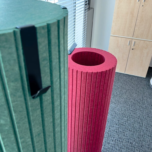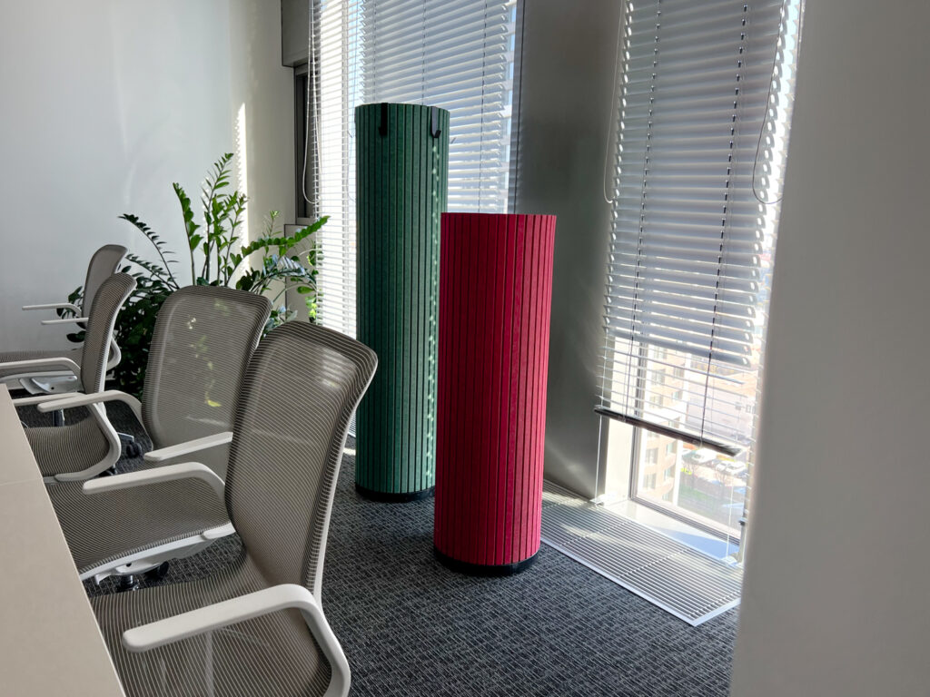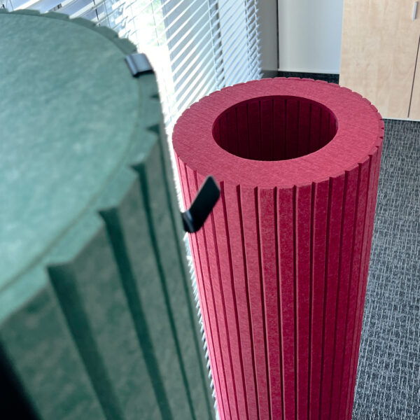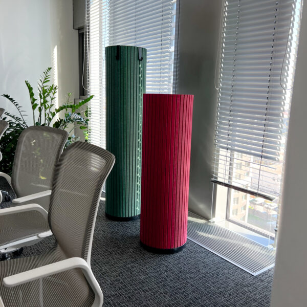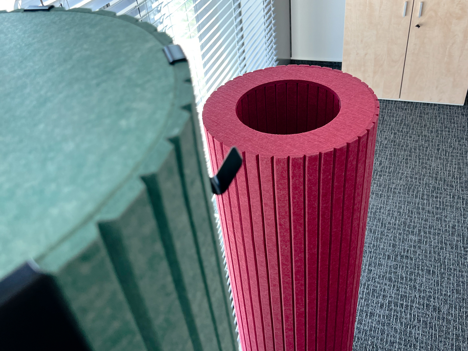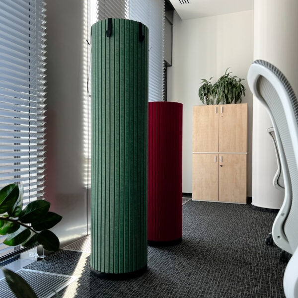 Akustické sloupy z recyklovaného materiálu a PET felt s vynikající pohltivostí zvuku.