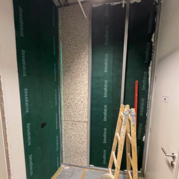Tento problém jsme vyřešili použitím systému Extra1 na cihlovou zeď. Tento systém zajistil účinnou zvukovou izolaci bez narušení funkčnosti nebo estetiky prostoru.