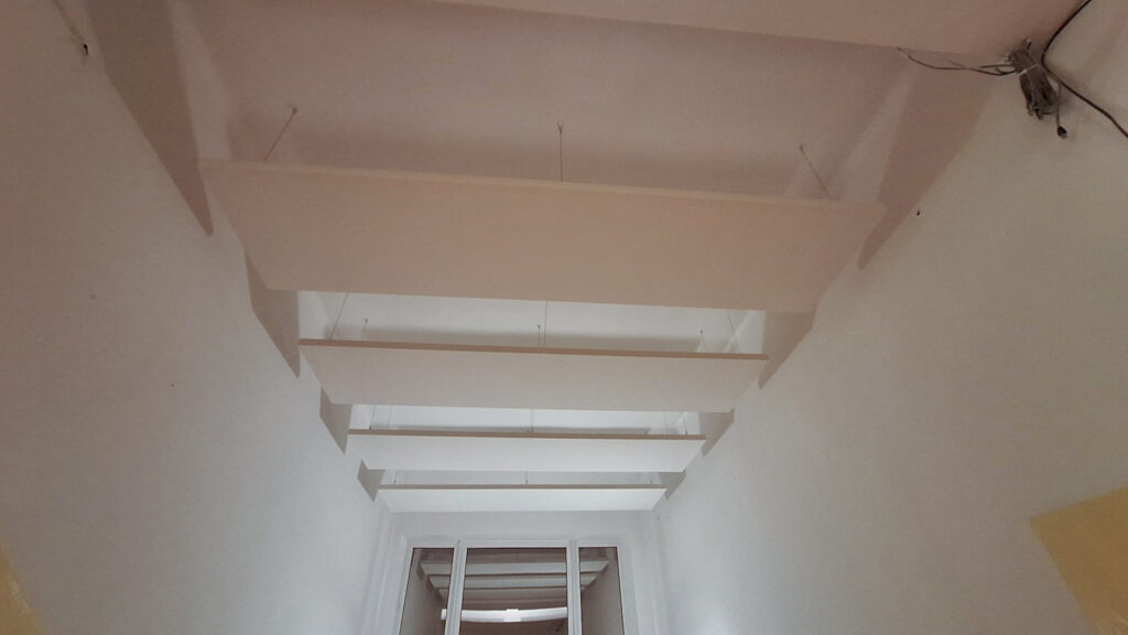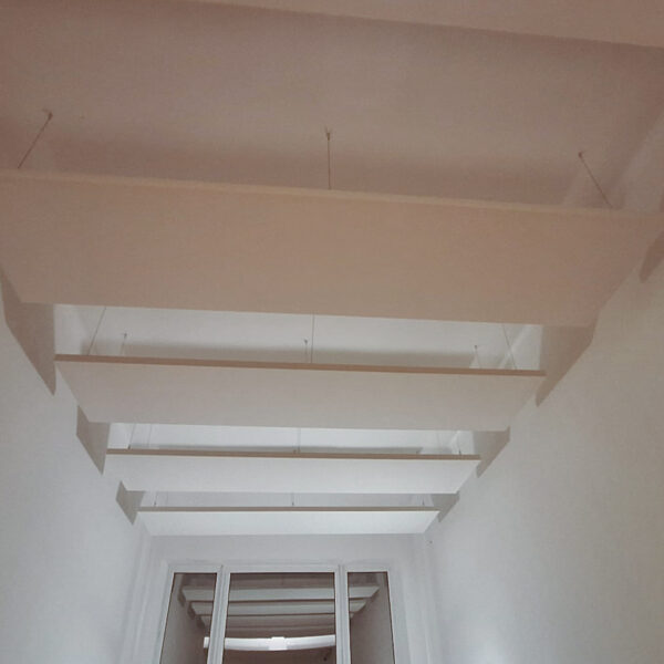 Chodby a schodiště, které byly akusticky náročné kvůli absenci nábytku, jsme vybavili podvěšenými panely v různých výškách a rozměrech. Kromě zlepšení akustiky tyto prvky vizuálně oživily prostor a narušily jeho původní fádnost.